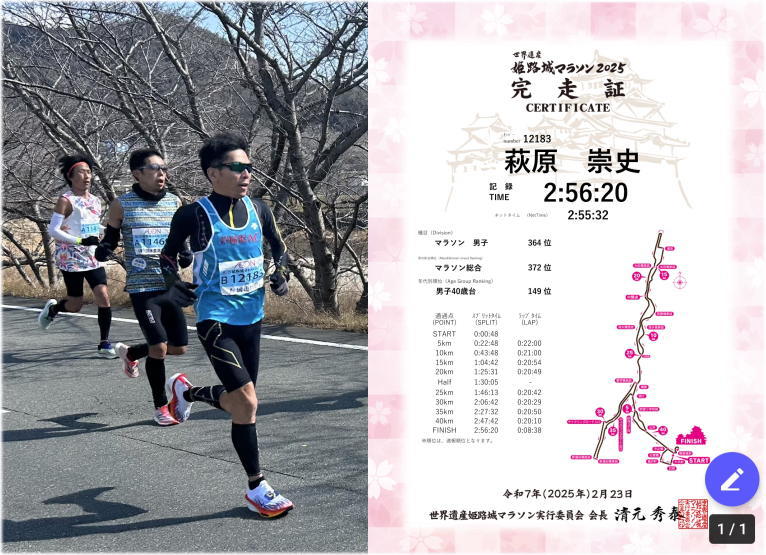 第840号 10年ぶり2回目のフルマラソンで初サブスリー! 2025年2月27日 AAC会員 萩原 崇史氏 こんにちは、萩原と申します。 先日、姫路城マラソンをネットで2時間55分32秒で完走してきました。 ①何故、10