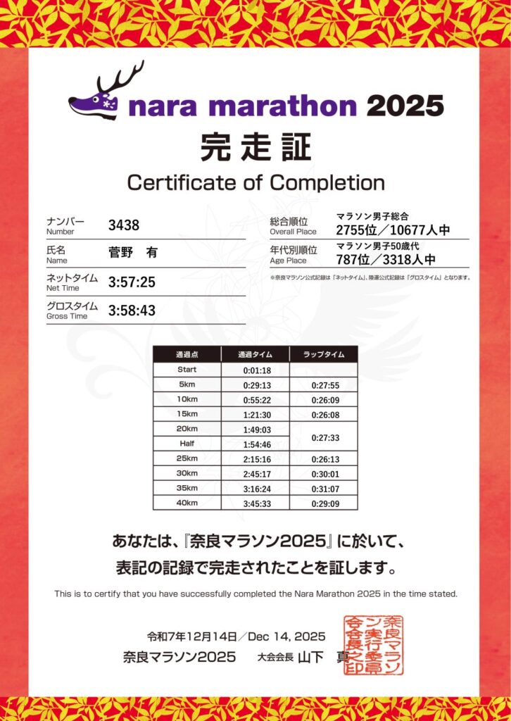 結果はネットタイムで3時間57分25秒。 今回ちょっと頑張れたので、姫路城マラソンに向けてもう少し足掻いてみたいと思います。