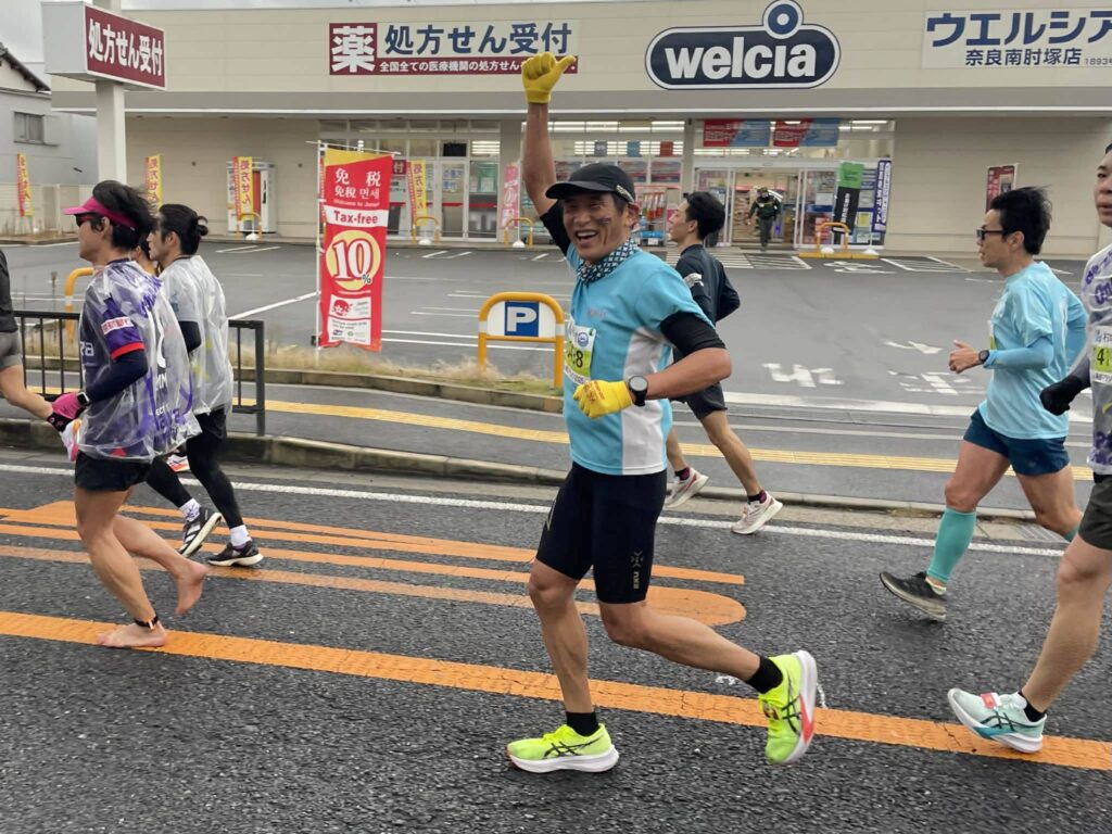 今回の目標はサブ4。近くに並んでいたランナーさんとお喋りしたりして、あまり緊張することなくスタートできました。途中、トイレに2回も寄りましたが、天理では楽しみにしていたぜんざいをいただいたりと、エイドも満喫。さすがに柿の葉寿司と柿最中はポケットに収納して、走り終わってから美味しく頂きました。