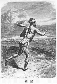 図1にあるような、右手と右足を同時に出す姿勢は、写真家がポーズを取らせて撮影したもので、実際に走っているわけではないことが多いようです。図2のように、絵で描かれた飛脚の姿には自然な動きがあり、右肩に文箱を担ぎながら左足を前に出すという自然なフォームが描かれています。