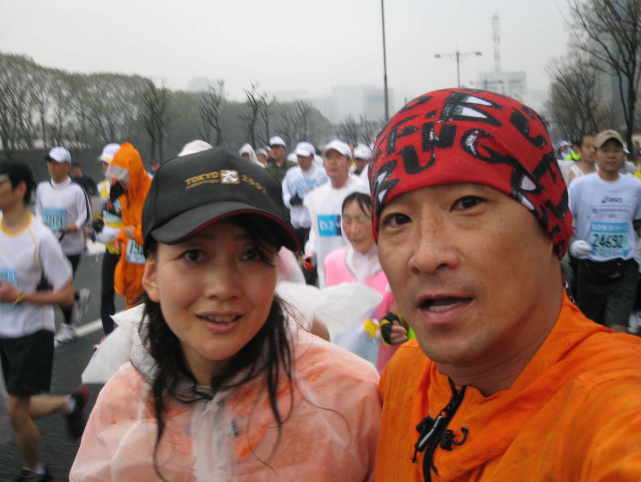 夫婦で初めて1緒に走ることになった第1回東京マラソン。今回は妻と運命共同体。妻と1緒に走り、妻が完走できなければ私もそれに付き合いリタイアすると決めての出場だった。コースの概略やその経緯については、妻が先の投稿で既に紹介済みなので、私のほうは少し高慢な言い方にはなるが、妻をサポートする立場でどんな思いでこの東京マラソンを走って(歩いて?)きたのかを綴らせて頂くことにしよう。それでは苦戦を強いられることとなった大会終盤を中心に以下。25㌔付近までは『おっ、なかなかやるな!』と感心していた妻の力走も、股関節や腰に疲労と故障が発生しはじめ徐々に失速。35㌔付近に至っては、妻はびっこ(使っちゃいけない言葉だが代替用語が見当たらないので失敬!)をひき、もはや誰がみても健康な人間の歩行状態ではなくなっていた。このときで1㌔15分ペース。『こりゃもう駄目かな。』焦る気持ちは徐々に落胆の気持ちへ。10000事休すか。プレッシャーを与えてはならないと思いつつも、後になって「ちゃんと教えてくれてたらもう少し頑張れたのに!」といわれても困るので、私:「あのねぇ、、、現実的な話するようで悪いねんけど。。。」妻:「なに?」私:「このままのペースでいったら時間内完走は無理やよ。」妻:「・・・」私:「いや、それはそれで別にいーねんよ。無理なもんは無理やねんからさ。」妻:「・・・」しかし、こんなメッセージを発信しても、それに対して妻が無言であったことから彼女も現状で精1杯、どうすることもできない状態であることが窺えた。そうこうしているうちに制限時間をオーバーするランナーを回収する収容バスの姿がチラチラと目に入るようになってきた。今まで収容バスをこんなに脅威に感じたことはない。私達の後ろで待機するようにゆっくり走っては追い越し、追い越してはまた徐行する。バス会社は“はとバス”であったが、私達にとっては“はと”どころか“禿げ鷹”に狙われた息絶え絶えの獲物の心境であった。エイドステーションで費やすロスタイムさえ時間内完走に大きな影響を与えるほどの微妙な時間になってきていたが、どうせこの状態で歩いていても時間内完走は見込み薄となっていたので、ここは1か8かの勝負でエイドステーションの治療による回復に望みを繋げることにした。幸いマッサージやアイシング等を施してもらうことで、その後暫らくは早歩きが可能となり、私なりの計算では半ば諦めかけていた時間内ゴールに1陣の光が射してきた。ちょうどその頃には雨があがり、現実の世界でも光が射しはじめ、観客の方々から「急げばまだ間に合う!」と条件付きの声援を頂き、そんな声援も味方にして頑張った。そして“あと1㌔”の看板をみた妻が、急に息を吹き返したように元気になって早歩きのラストスパート!ゴールまであと数10㍍ほどのところで、妻に「走れる?」と聞いてみたら「うん!」という返事が返ってきたので、そこからは恥ずかしげもなく手を取り合って、観客やスタッフの大声援を受けながら最後のラン!そしてぎりぎりのゴール!制限時間の7時間まで、僅か8秒を残して6時間59分52秒のゴールだった。結局タイムリミットぎりぎりでゴールしたものの、私達のすぐ背後にもランナーの気配を感じていたので、そのときは最終ランナーだと思っていなかった。ゴール直後に記者らしき方に、「最終でゴールなさいましたね!」といわれて初めて『あれ、そうなの?』と思ったが、実は今回の東京マラソン、仕事の忙しい時期に明確な理由も示さず土曜日に休暇をとって抜け出してきていたものだから『こりゃやばいっ!』と思い、咄嗟に「いえ、違います!私達の後にゴールした方がおられました!」といったのだが、その記者は「いえ、あなた達が最後でした。私、ちゃんとみてました。」としっかり口調でニコニコ笑顔。そんなやり取りをしているうちに大勢の報道陣に瞬く間に取り囲まれてしまい、そうなるともうあとの祭り。『まっ、いいか!職場ではちょっと気まずいけど、犯罪をスクープされた訳でもなし!』と気持ちを切り替えるほかなかった。ついでに馬鹿話をすると、大会前、妻が冗談ながらに「どうせ遅いんだったら、いっそ最終ランナーになって脚光を浴びたら?って実家の母にいわれた。」…といったので「そんなアホなこと考えとる奴はどうせ1杯おるやろ!」と2人で笑ったこと記憶に新しい。しかしタイムリミットぎりぎりのところでゴールしたのでよくわかったが、最終ランナーになろうとタイミングを見計らっているようなアホな奴など1人もいなかった。皆、死ぬか生き残るのかの真剣勝負だった。さて、帰りの新幹線までそれほど時間にゆとりもなく、なにがなにやら分からぬ状態でバタバタと2人で列車に乗り込むことに。。。2人とも取り合えずは駅弁にがっつき、ようやく落ち着いたところで夫婦でゆっくり無事に終わった大会のことでも語らおうかと、ふと妻のほうをみると、妻は既に寝息