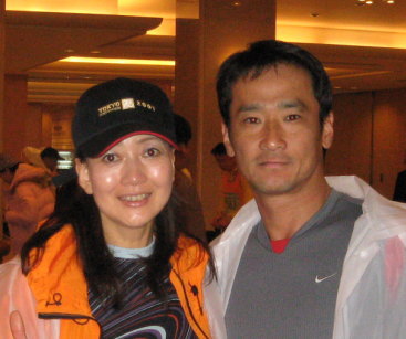 12年前にホノルルマラソンで初めてマラソンを経験し、6時間という長時間で完走。楽しかったけれど、それが人生最初で最後のマラソンだと思っていました。夫に誘われ、310000人募集に対しかなりの競争率になるだろうと聞き、「当たるはずないわ」と軽く応募に賛同。それが、それが、何と夫婦で当選!♪い~ぬは喜び♪ではないけれど、夫は喜び部屋駆け回り、私はベッドで丸くなってしまいました。この12年間、ウオーキングはしてもランは全くしていないし、運動も軽くエアロビクスに参加する程度。始めは当選ハガキをヤフーオークションに出品しようかと考えたが(^^;)、本人でないと出場できないよと夫に睨まれ断念、出場を覚悟。しかしトレーニング無しに月日だけが経っていく。ついに夫がしびれを切らし始め、目先の目標として加古川マラソン10㌔、長居公園での駅伝、神戸バレンタイン・ラブラン10㌔に私をエントリー。それに向けて、私もようやくトレーニングらしきものを開始し、神戸での10㌔では余力を残して自己タイムを更新、走ることが楽しく感じるようになってきたのでした。結局10㌔以上のトレーニングをすることもなく東京マラソン当日を迎える。スタート時の気温は5度と寒い上に、天候はあいにくの雨。整列しているランナーもガタガタと震えが止まらない様子。でも、気分は高揚し何だかお祭り気分!9時10分、石原知事の号砲とともに、紙吹雪が舞う中、21000051000人が徐々に出走。いよいよだ!大勢の報道陣のカメラや沿道の応援者の雄叫びに似た声援、それに応えるランナー達の興奮が、東京マラソンが尋常のマラソンでないことを実感させる。このイベントに参加できた幸運を今になって噛みしめ、この機会を作ってくれた夫に感謝であった。新宿→神楽坂→皇居を右手に見ながら10㌔地点まで雨も忘れて快走。ここからは12年ぶりで未知の世界に等しい。リセットのつもりでストレッチをする。夫は冷えからかトイレに駆け込むが既に長蛇の列。ここで20分も費やし、再スタート。右手に東京タワーが見えてきたが霧でかすみ、下半分だけのお目見えだった。13㌔地点で靴の中に違和感を覚える。脱いでみると、ランナーズソックスに穴が開き、親指が突き出ているではないか!しかも既に白い水ぶくれが・・・。何がランナーズソックスよ!訴えてやる!と息巻きながらワセリンを塗って、ソックスの位置をずらし応急処置をして再スタート。15㌔付近の品川を過ぎ20㌔の銀座辺りも気持ちよくペースを落とさず快走、銀座・和光前では義姉が手を振ってくれた。もうすぐハーフだ!正直、このようなペースがゴールまで続くと錯覚していた。しかし、ハーフを過ぎてから急に太ももが張り出し足が重くなり、まるで足かせを掛けられたかのような感覚に陥る。22.5㌔地点のエイドSTでスプレーを振ってもらい、軽いマッサージを受ける。すると嘘のようにまた快調に走り出せたので、とりあえず次の25㌔地点のエイドSTまで頑張ることに。エイドSTごとに同じ処置を受けて走り続けようと目論んでいたら、何とスプレー切れで処置が受けられないことに。愕然としたと同時に、足が、足が・・・こわばって思うように走れなくなってしまった。本当に突然の変化としか思えない。徐々に足が動けなくなったというのではなく、魔法にかかったかのごとく急に足が棒になってしまったのだ。25㌔過ぎからは、走りではなく早歩き。あれだけ短く感じた1㌔が長い距離に感じるようになってきた。ストレッチと夫によるマッサージを受けながら28キロ付近の浅草・雷門までようやく到達。ここでお約束の記念撮影。浅草伝統の連獅子の舞がランナーを迎えてくれていた。気持ちは励まされるが、足の復活には繋がらない。32,3㌔地点まで早歩きの状態を続け、ここから何とか走り出す。あの信号まで、そして次の信号まで、また次の信号までと自分に言い聞かせながら走り続けるも1㌔ももたなかった。しかも、それがたたったのか、今度は右坐骨に痛みが走り出し、歩行さえ困難に感じるようになってきた。35㌔付近の歌舞伎座も朦朧と目にしただけだった。沿道から同情に近い声援を受けながら、足を引き摺り、右手で坐骨神経を押さえながら1歩1歩進む。今度は100㍍さえ、とてつもなく長い距離に感じ始める。しかも悪循環で走っていれば身体も温まるが、まさしく“牛歩”なので冷え切って1層神経や関節が痛む。気づけば1㌔に15分もかかり始めたので、夫が真剣に制限時間のことを気にし始めるようになった。36㌔近く、ここで既に5時間半以上。途中のドラッグストアでエアーサロンパスを夫が購入、スプレーしてくれたが、それでも痛みに耐え切れず、38㌔地点のエイドSTに駆け込む。今度はベッドで整体を施してくれた。「極楽~♪」なんて思っていると、38.1㌔地点の第8関門閉鎖まで残り3分、収容バスの話が!夫の顔の焦りの色が1層濃くなっている。本当はもっと整体を受けていたかったのだが、そそくさと靴を履