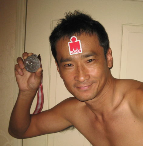 何気ない妻のひとことがきっかけとなって始めることとなったトライアスロンも、今年で早や2シーズン目を迎えることとなった。そして今回の2007アイアンマンジャパンは自分にとって、初のロングトライアスロン挑戦となる。それまでは言い出しっぺだったこともあってトライアスロンには常に協力的な妻だったが、今年に入って私が「6月にアイアンマンレースにでるわ!」といったら、「え゛~っ、アイアンマン~ッ?私はそこまでやってとはいってないよぉ~!」と、意外なことに真剣な顔で心配し始めた。振り返ってみると昨年の5月に青垣のスプリントトライアスロン(約25㌔)でデビューしたときには、『性に合わなけりゃトライアスロンは1回きりでヤメッ!』と思っていたので、そこから考えるとよくもここまでエスカレートしたものだ。別にトライアスロンが他のスポーツと比べて特に楽しいと感じた覚えもないのに、なぜか次から次へと貪欲にエントリーしたくなる不思議な魅力の精神スポーツ。さて長崎滞在中、大会開催日以外は唄の文句と同様みごとに“長崎は今日も雨だった♪”…のに、この日ばかりはスポットライトを浴びたかのように晴れ間が射し込み、絶好のトライアスロン日和がロング初挑戦の私を優しく出迎えてくれた。レース前には応援して下さっていた方々に、『とにかく時間内完走することだけが目標なんです!』なんて謙虚なことをいっていたが、それはリタイヤしたとき用の照れ隠し。本心はヤル気満々だった!<(`^´)>ただ、自分にとって未知の距離への挑戦ではあったので、“完走が目標!”というのもまんざら嘘ではなかったのだが、心のどこかで『自分の身体はロングむきに違いない!』という期待感もあり、腹の中では『悪くても半分以内に、あわよくば上位3分の1以内に!』なんて、甘いおめでたい期待感を持っていたのだった。ところで肝心のレース内容についてはなぜか具体的な記憶があまり残っていない。苦しさもあまり感じなかった代わりに楽しむというほどのゆとりもなく、1日中無我夢中で福江アイランドを駆け回っていたという感じだ。そんな訳で気がついてみれば、ただひたすら私を待ち続けていてくれていた妻と念願のゴールを果たしていた。結果は12時間51分48秒。リタイヤした方も含めて340/723位と辛うじて半分以内の成績で、やはり『あわよくば…』はなかった。(スイム終了時576位→バイク終了時470位→ラン終了時340位)ただ、大したアクシデントもなく最後までベストを尽くした結果がこれなので悔いなど1切なく、今の実力ではこれで精1杯だと感じたし、精1杯やれたこと自体が嬉しかった。また、私より上位には既に還暦を迎えたベテラントライアスリートや女性もたくさん含まれており、そういった方々には“脱帽”のひとことだ。大会終了直後には緊張感から開放されたこともあってか、レース中にはあまり感じなかった疲労感をジワリジワリと感じ始め、『こんなにしんどいことは2度とやらんぞっ!』と思ったのが正直な感想。。。それが翌日になると、独り温泉に浸かってボ~ッと湯気をみながら『来年はどうやってタイムを縮めてやろうか。』と真剣に攻略法を考えている自分がいるのだから滑稽だ。なぁ~んだか、、、変な遊びに嵌まり込んでしまったものだ。しかし順位やタイムがどうこうということとは別に、アイアンマンレースがこの世に自分が健康な身体で生まれてきた喜びを強烈に味あわせてくれた大会であったことに間違いはない。この実感こそがこれまで頑張った自分へのなによりの報酬だろう!応援して下さった皆様ありがとう!生涯誇れる最高の勲章をゲットした!(大会開催日:2007・6・17)IamIRONAN!!!